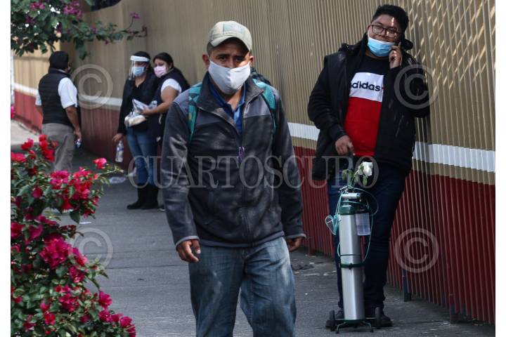 Paramedico espera a las afueras del área de urgencias con un tanque de oxígeno en una camilla.