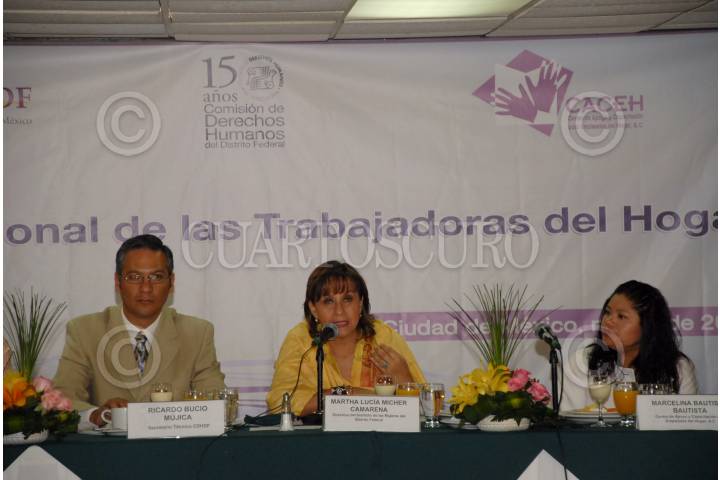 MÉXICO, D.F., 26MARZO2009.- Ricardo Bucio, Martha Lucía Micher y Marcelina Bautista durante el evento de celebración a las trabajadoras del hogar, que se llevo acabo en la Comisión de Derechos Humanos del D.F. FOTO: IVAN MENDEZ/CUARTOSCURO.COM