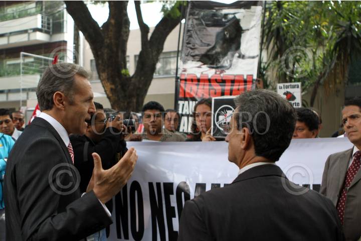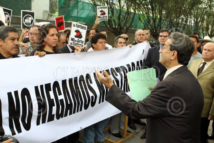 MÉXICO, D.F., 09SEPTIEMBRE2010.- Heriberto Murrieta y Rafael Loret de Mola, al lado de integrantes del Consejo Nacional Taurino de Aficionados y Peña Taurina de México se manifestarón contra la Ley Antitaurina de Cataluña y a favor de las corridas de toros, a su vez integrantes de la organización Anima Naturalis protestaron en contra de las corridas de toros; ambas protestas se realizaron a las afueras de la embajada de España. FOTO: RODOLFO ANGULO/CUARTOSCURO.COM
