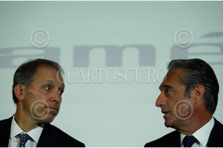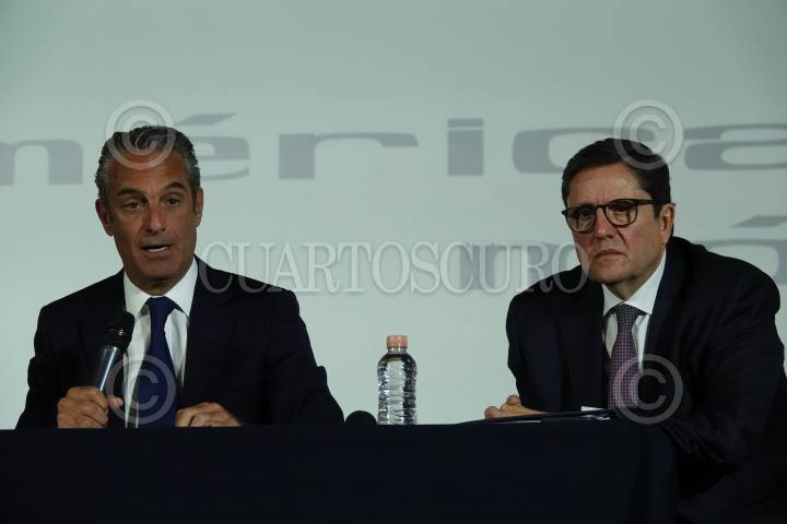 Daniel Hajj y Carlos Slim Domit durante la conferencia de América Móvil en el Museo Soumaya.
