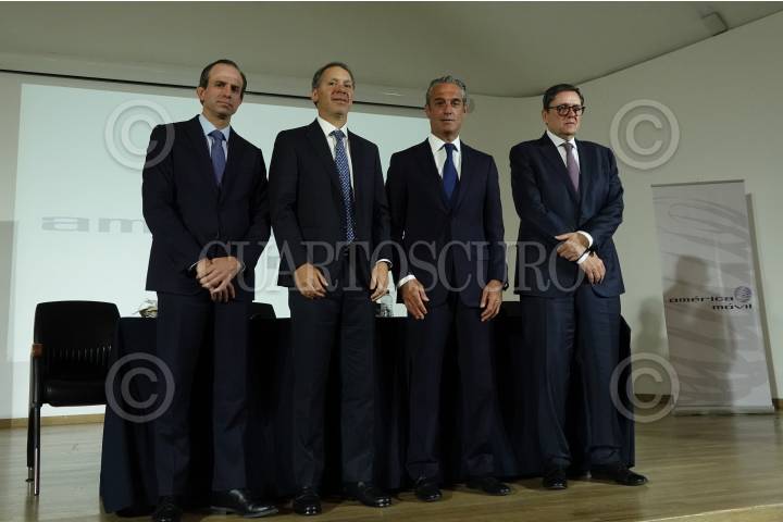 Alejandro Cantú; Daniel Hajj; Carlos Slim Domit, y Oscar Von Hauske durante la conferencia de América Móvil en el Museo Soumaya.