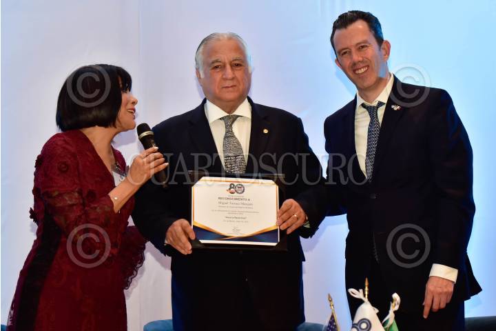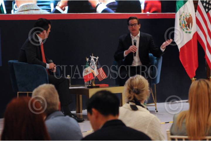 Miguel Torruco, secretario de Turismo, y Larry Rubin, presidente de “American Society of Mexico” y al finalizar la plática “Hacia la recta final” en la se presentaron los avances en materia de políticas turísticas entre México y Estados Unidos.