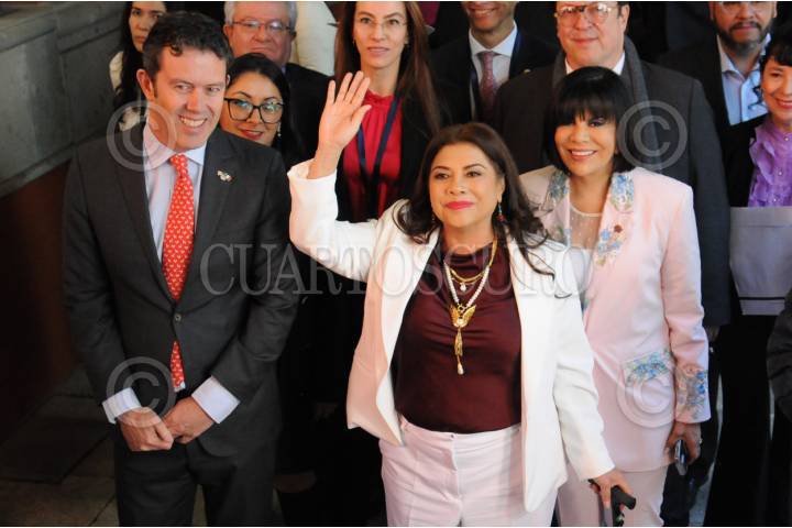 CIUDAD DE MÉXICO, 21FEBRERO2024. - Clara Brugada, candidata de la alianza Sigamos Haciendo Historia, saluda a los medios a su llegada a con los integrantes de la American Society. FOTO: DANIEL AUGUSTO /CUARTOSCURO.COM