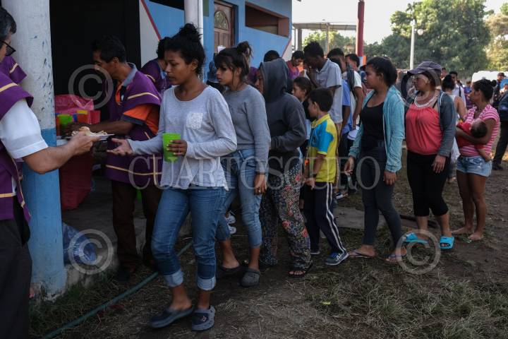 Migrantes reciben alimentos por parte de la iglesia católica en un albergue provisional.