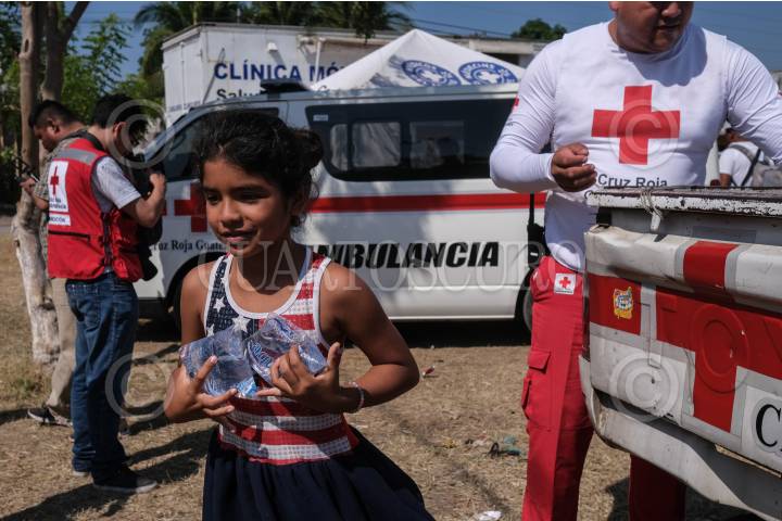 Migrantes reciben agua por parte de la Cruz Roja en un albergue provisional.