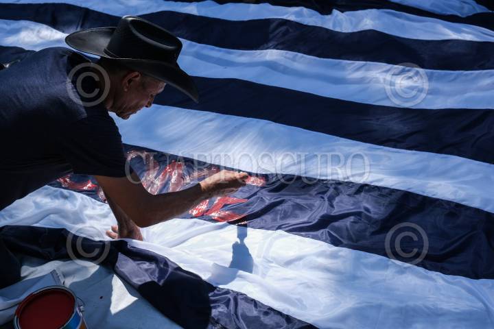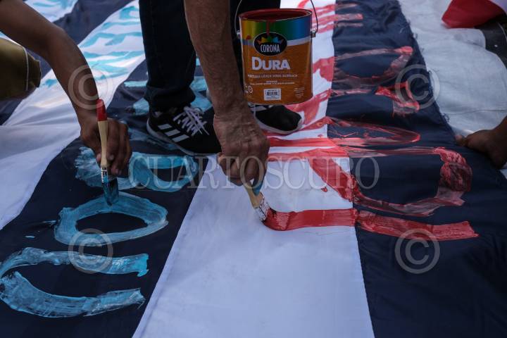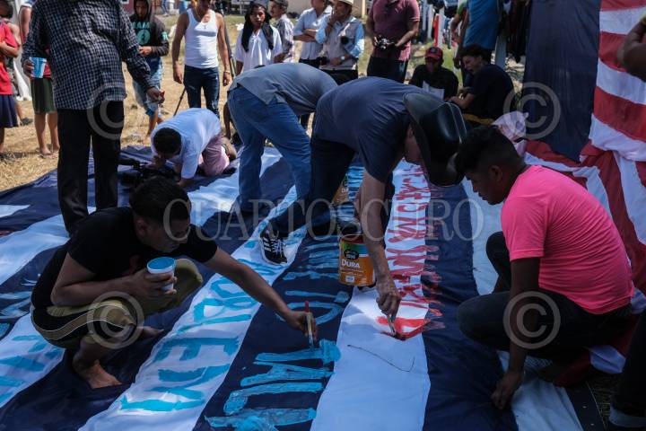 Migrantes pintan mensajes en una bandera preparándose para salir en caravana de nuevo.