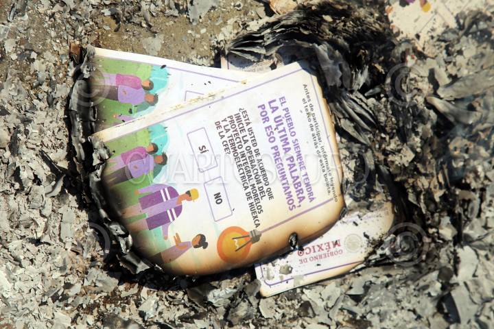 TEMOAC, MORELOS, 24FEBRERO2019.- Habitantes de Amilcingo que se oponen a la consulta sobre el funcionamiento de la termoeléctrica de Huexca regresan del municipio de Jonacatepec donde sustrajeron dos urnas con votos de mesas receptoras. Las boletas después fueron quemadas en la plaza central del poblado. A unas horas que termine este ejercicio promovido por el gobierno federal se vive una tensión creciente en el oriente del estado. En la imagen una de las boletas quemadas. FOTO: ESPECIAL /CUARTOSCURO.COM