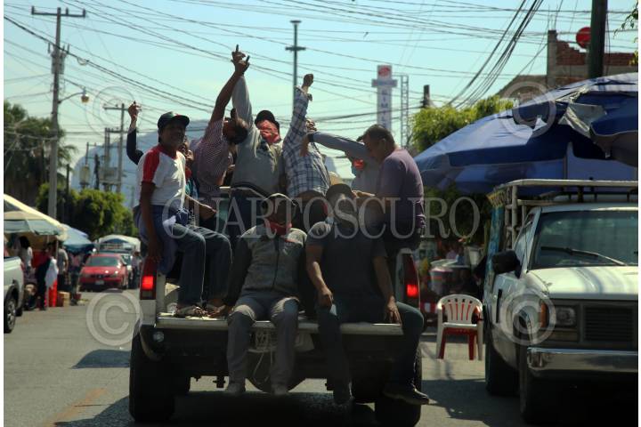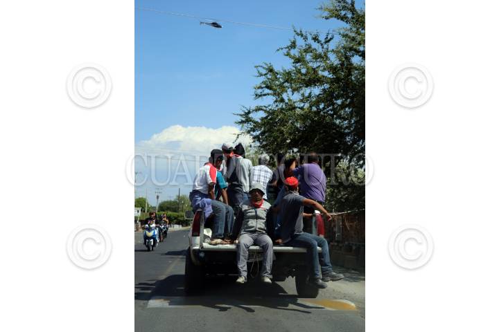 TEMOAC, MORELOS, 24FEBRERO2019.- Habitantes de Amilcingo que se oponen a la consulta sobre el funcionamiento de la termoeléctrica de Huexca regresan del municipio de Jonacatepec donde sustrajeron dos urnas con votos de mesas receptoras. Las boletas después fueron quemadas en la plaza central del poblado. A unas horas que termine este ejercicio promovido por el gobierno federal se vive una tensión creciente en el oriente del estado. En la imagen opositores reaccionan a la vigilancia que hace sobre ellos la Comisión Estatal de Seguridad con un helicóptero. FOTO: ESPECIAL /CUARTOSCURO.COM