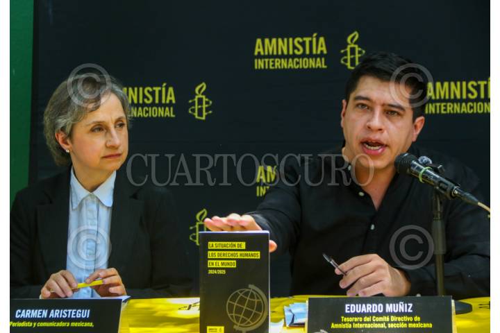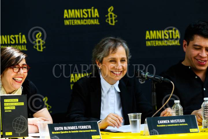 CIUDAD DE MÉXICO. 29ABRIL2025.- Informe anual: "El estado de los derechos humanos en el mundo". Con la presencia de las directoras para las Américas y de la sección mexicana, Ana Piquer y Edith Olivares Ferreto, respectivamente, así como de la madre buscadora Araceli Rodríguez y una persona migrante trans Venezolana Rosy González. Moderaron periodista Carmen Aristegui y Eduardo Muñiz y se llevó acabó en la Casa Refugio Citlaltépetl. FOTO: VICTORIA VALTIERRA/CUARTOSCURO.COM