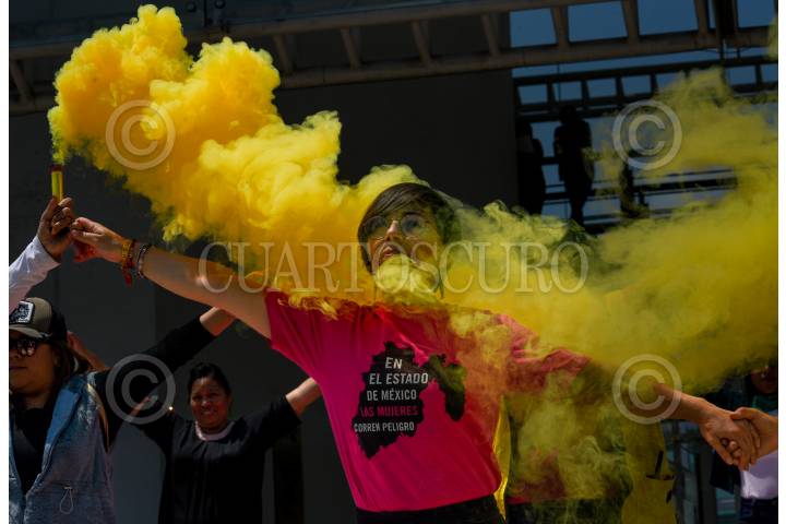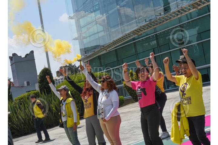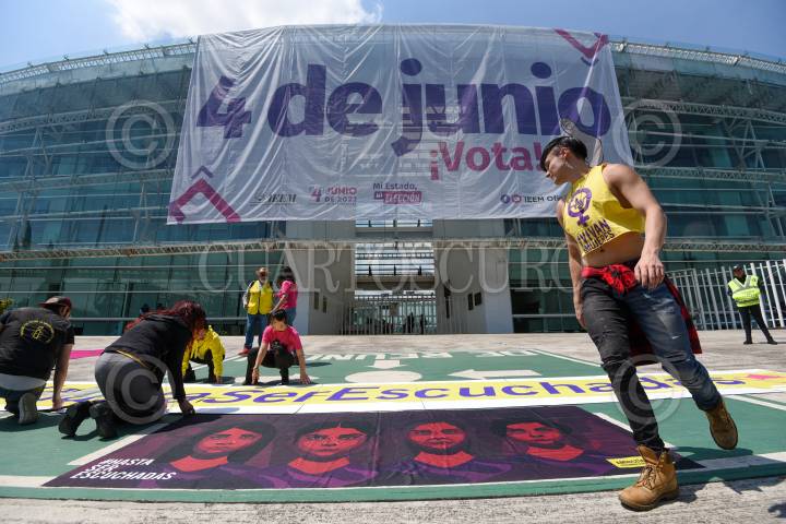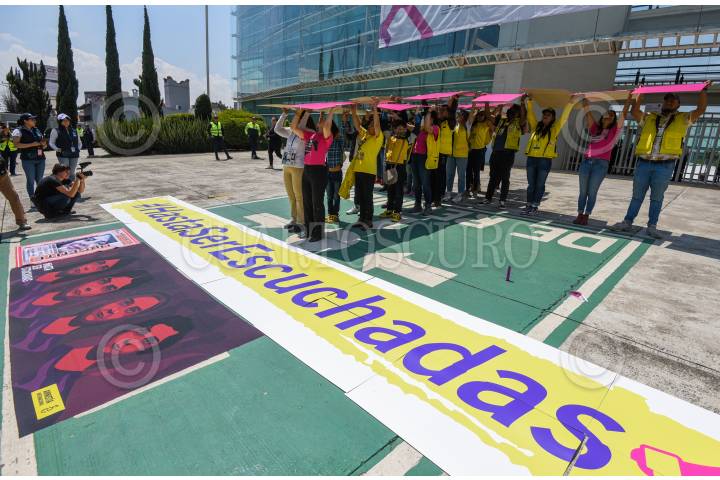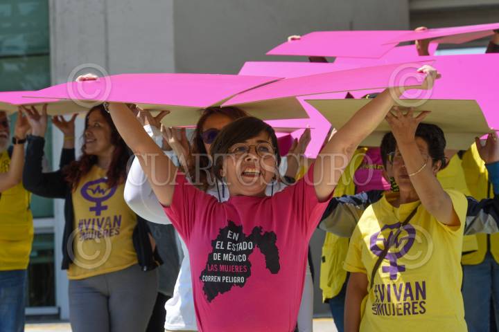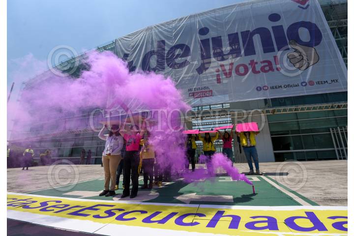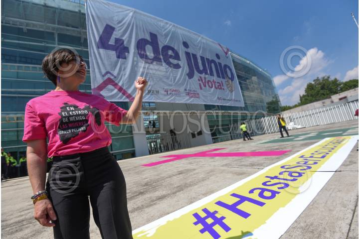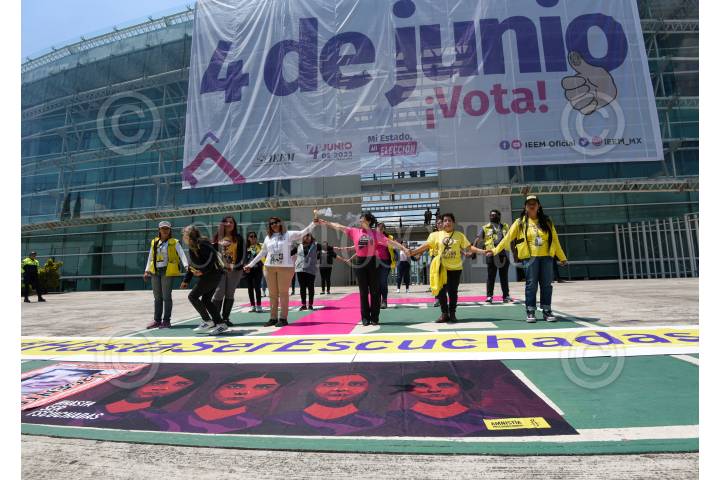 Integrantes de Amnistía Internacional realizaron una acción simbólica en el Instituto Electoral del Estado de México en el marco del 2do debate de las candidatas a la gubernatura del Estado de México para que se comprometan a disminuir y erradicar los feminicidios del Edoméx.