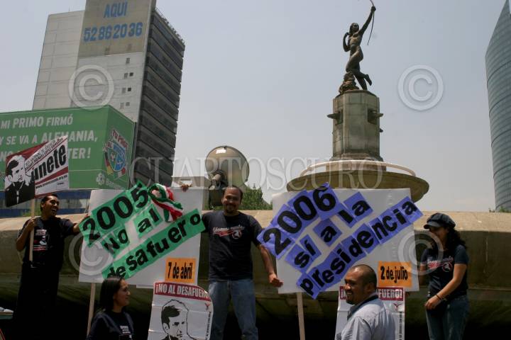MEXICO, D.F., 07ABRIL2006.- Jovenes que apoyan a el candidato presidencial Andrés Manuel López Obrador, se manifestaron en la glorieta de la Diana para recordar el desfuero que vivió el tabasqueño por parte de la Cámara de Diputados. FOTO: Moisés Pablo/CUARTOSCURO.COM