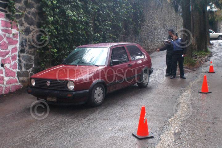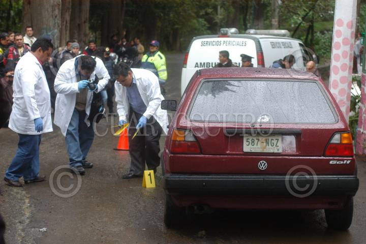 MÉXICO, D.F., 08ENERO2010.- Un sujeto de aproximadamente 40 años, fue descubierto sin vida al interior de un auto Golf de color rojo con placas de circulación 587-NGZ, sobre la calle Rancho Pachita de la colonia El Ocotal en la delegación Magdalena Contreras. Dicho sujeto presentaba impactos de arma de fuego y se encontraba esposado con las manos hacia la espalda. Al lugar arribaron peritos de esta demarcación para tomar conocimiento de los hechos y levantar el cadáver. FOTO: LUIS CARBAYO/CUARTOSCURO.COM