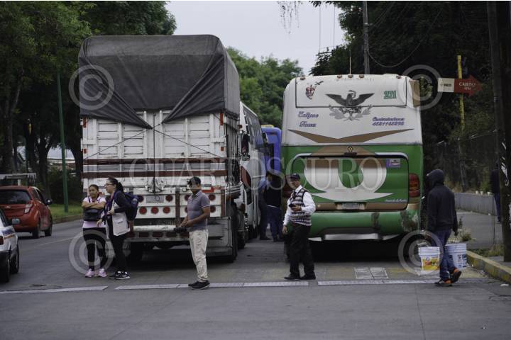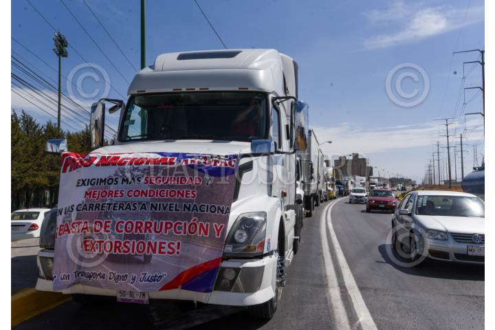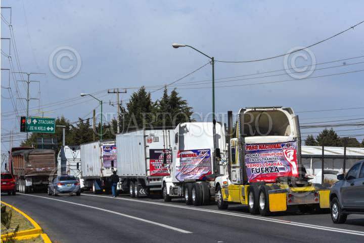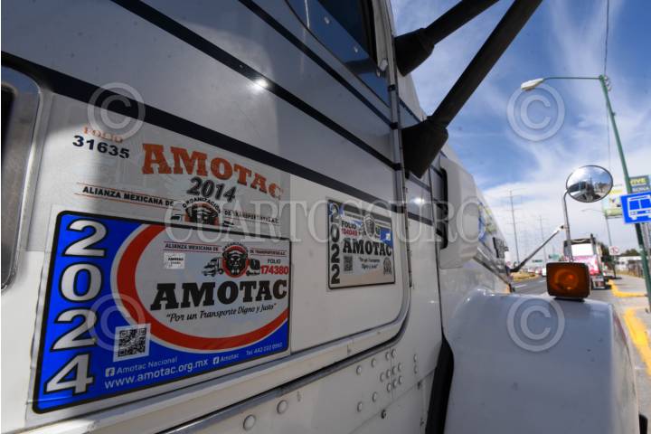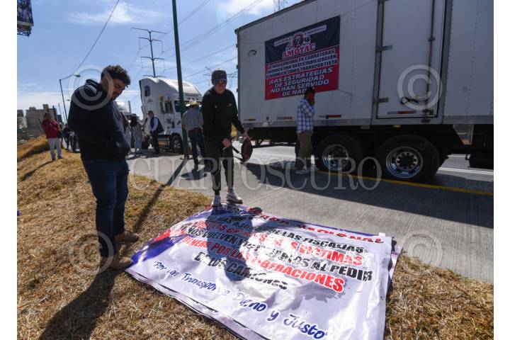 ZINACANTEPEC, ESTADO DE MÉXICO, 15FEBRERO2024.- Transportistas integrantes de la Alianza Mexicana de Organización de Transportistas A. C. AMOTAC del Valle de Toluca se unieron al Paro Nacional ante la inseguridad que se vive en las carreteras provocando y de la cuales son víctimas constantemente, y ante las estrategias de seguridad que no les han servido y piden se resuelvan puntos como Seguridad en Carreteras, Prohibición de vehículos doblemente articulados, Tarifas oficiales, alto a los abusos policiales por parte corporaciones policiacas, entre otros puntos. FOTO: CRISANTA ESPINOSA AGUILAR /CUARTOSCURO.COM