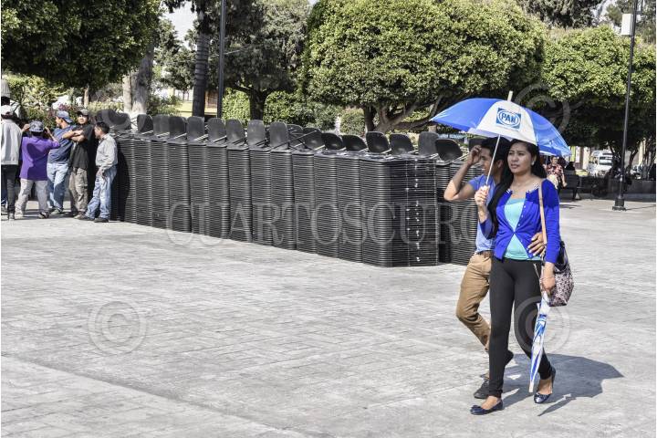 AMOZOC, PUEBLA, 05ABRIL2018.- Simpatizantes del candidato a la presidencia, Ricardo Anaya, se reunieron en la explanada principal de Amozoc, para escuchar las propuestas de campaña del candidato panista. En la imagen, dos jóvenes llegan al evento, mientras al fondo se observan sillas que no fueron utilizadas en el mitin. FOTO: MARIO JASSO /CUARTOSCURO.COM