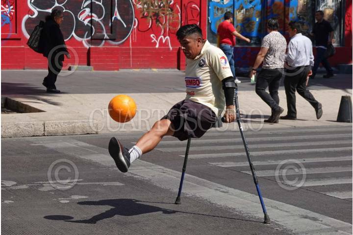 CIUDAD DE MÉXICO, 12FEBRERO2025.- Un joven con una amputación en su pierna izquierda realiza trucos con un balón de fútbol sobre Avenida Juárez, en el Centro Histórico. FOTO: GRACIELA LÓPEZ/CUARTOSCURO.COM