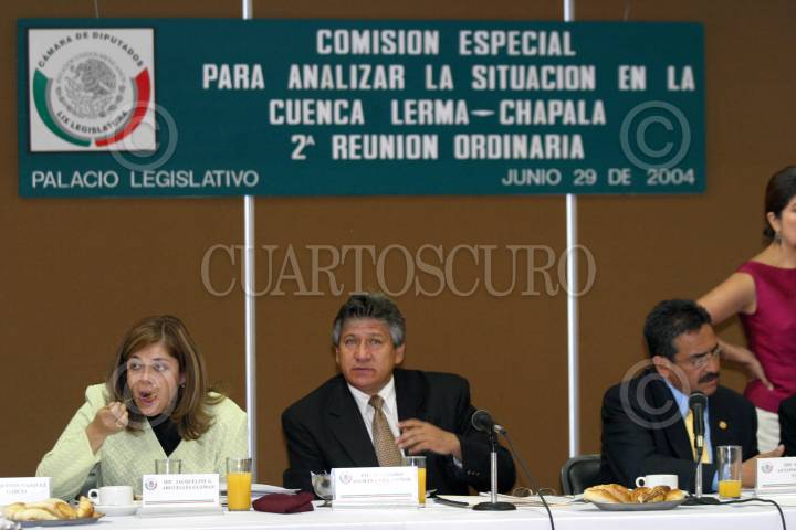 México, D.F. 29 JUNIO 2004.- Los integrantes de la comisión especial para analizar la situación en la cuenca Lerma-Chapala, Jaqueline Arguelles, Alejandro Saldaña y Roberto Marruto Torres en reunión de trabajo donde trataron el tema del agua potable. FOTO: Sandra Perdomo/CUARTOSCURO.COM