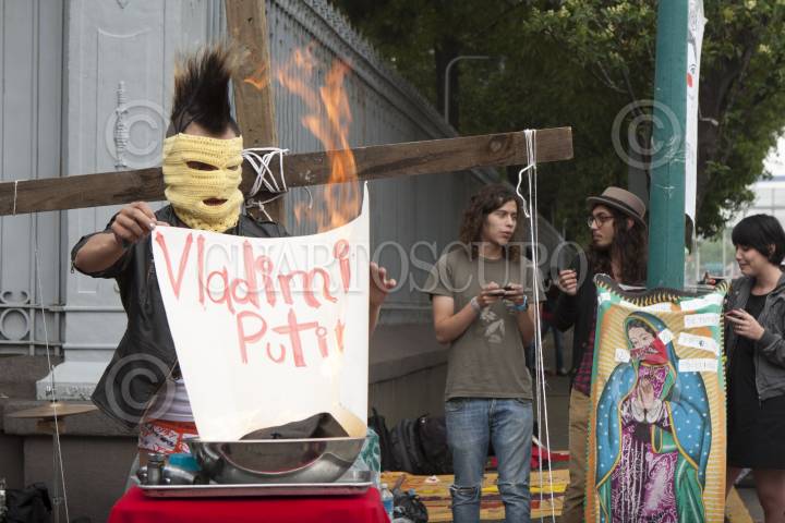 MÉXICO, D.F., 24AGOSTO2012.- Integrantes del espacio Anarcopunk realizaron una protesta a las afueras de la Embajada Rusa en apoyo a las integrantes de la banda de Punk rusa, "Pussy Riot" que fueron condenadas el viernes pasado a dos años de prisión por vandalismo cuando cantaron una cancion anti Putin en la iglesia Ortodoxa del Cristo Redentor. FOTO: FRANCISCO RODRÍGUEZ /CUARTOSCURO.COM