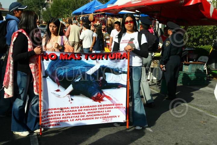 MÉXICO, D.F., 05FEBRERO2008.- Jóvenes se manifestaron en la entrada de la Plaza de Toros México en contra de la fiesta brava, durante el 62 aniversario del Coso más grande del mundo. FOTO: ISAAC ESQUIVEL/CUARTOSCURO.COM