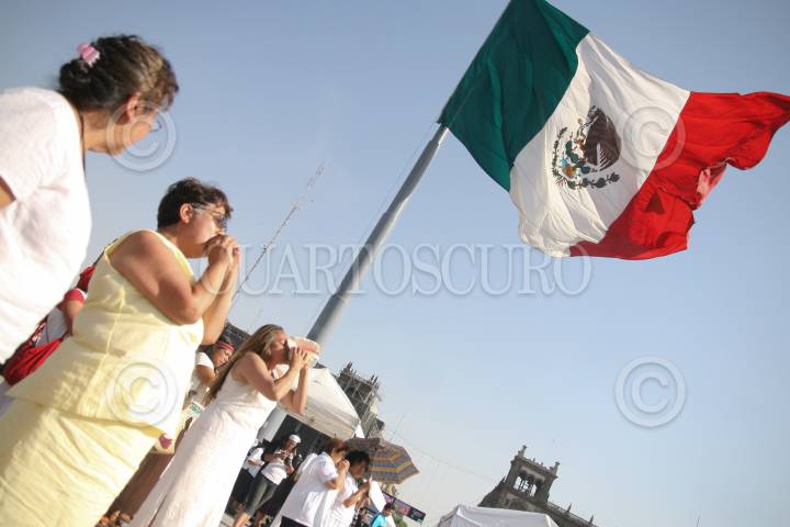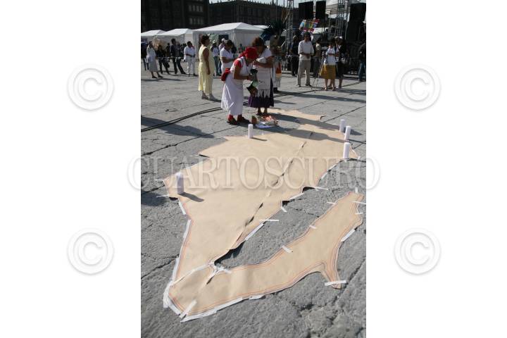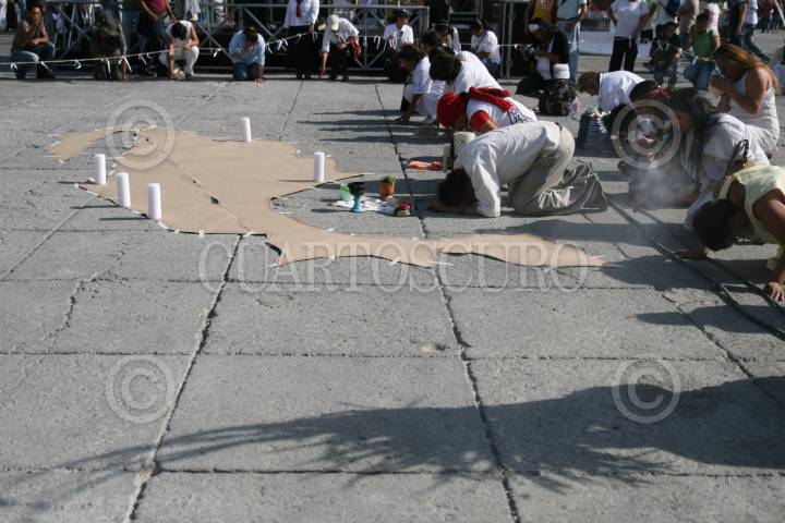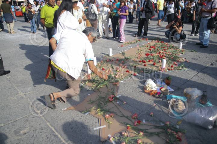 MÉXICO, D.F., 02MAYO2010.-Organizaciones no gubernamentales se manifestaron pacíficamente en la plancha del Zócalo, donde pidieron por la Paz en el país y en el mundo entero. Ahí realizaron un rito ancestral en donde colocaron un mapa de México en papel cartón y de igual manera le colocaron flores. FOTO: MARCO POLO GUZMÁN HERNÁNDEZ/CUARTOSCURO.COM
