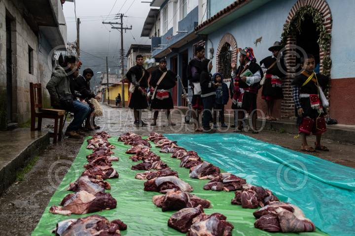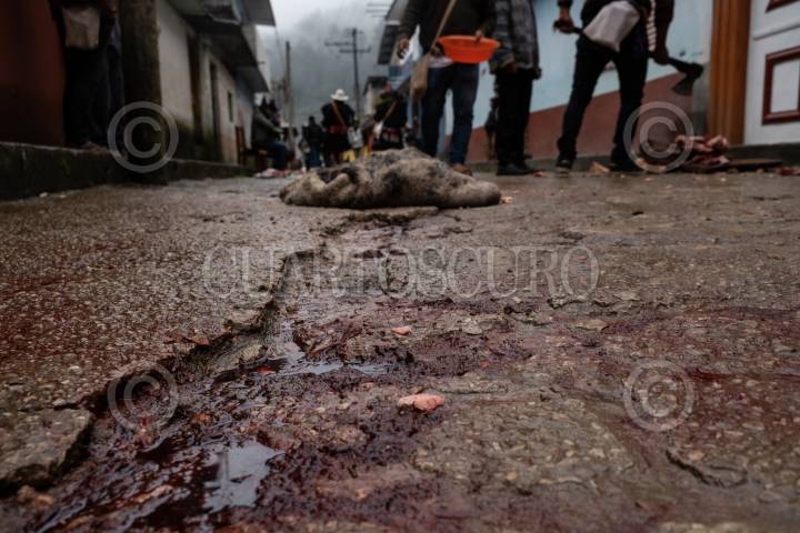 La piel de la res sacrificada para el Carnaval escurre las ultimas gotas de sangre a fuera de la casa del Balkilal, encargado de que se lleve a cabo la fiesta.