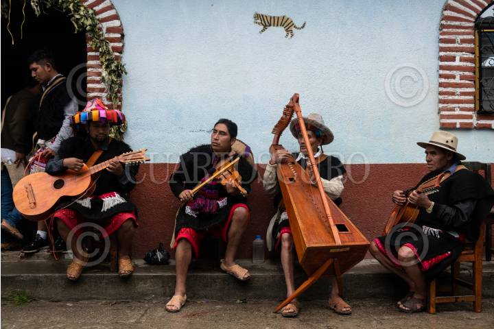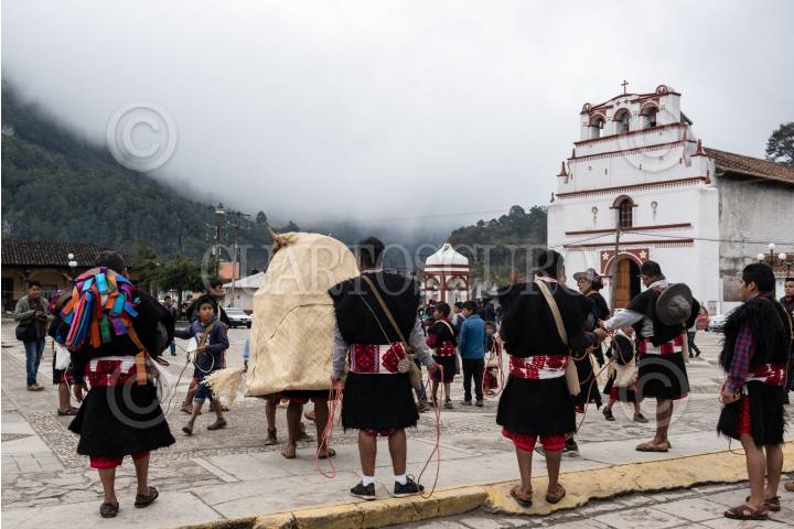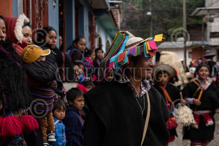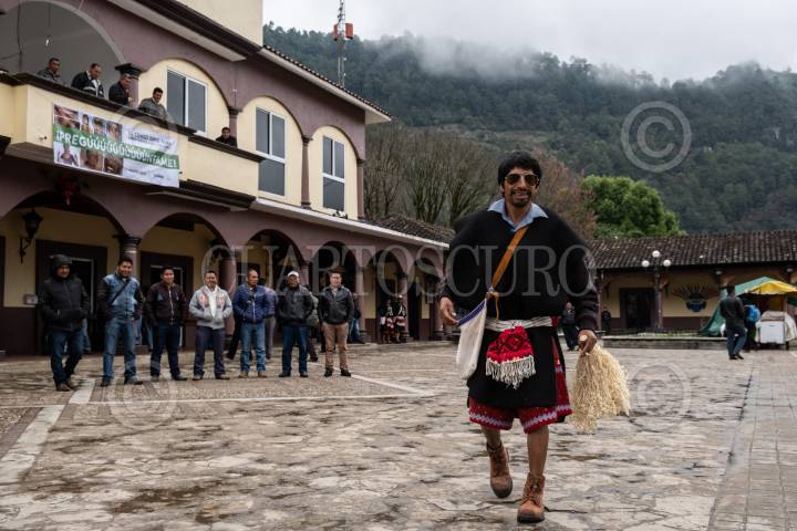 Uno de los cantores tradicionales camina sobre la plaza principal de Tenejapa.