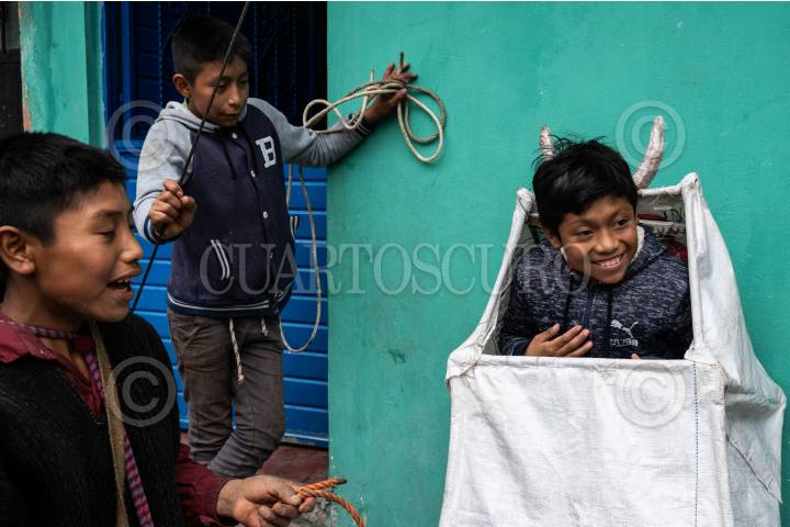 Algunos de los niños replican los toros tradicionales con materiales más fáciles de conseguir y en grupos salen por las calles como lo hacen las autoridades tradicionales.