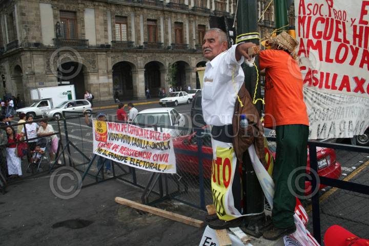 MÉXICO, D.F. 4AGOSTO2006.- En la plancha del Zócalo capitalino y calles aledañas se han instalado campamentos de simpatizantes del PRD. De espaldas a la plancha del Zócalo, un anciano se crucifica como un gesto de apoyo a Andrés Manuel López Obrador. FOTO: Paola HidalgoCUARTOSCURO.COM