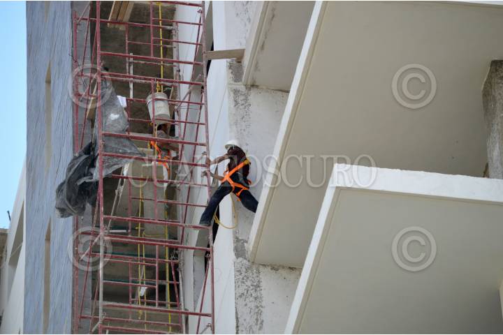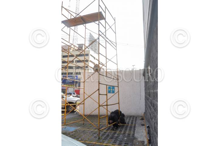 Un hombre, arriba de un andamio sin protección alguna, pinta la fachada de un supermercado próximo a inaugurarse ubicado al norte de la capital.
