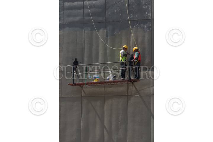 Obreros aseguran el andamio en el que van a trabajar para reparar un muro en avenida Reforma.