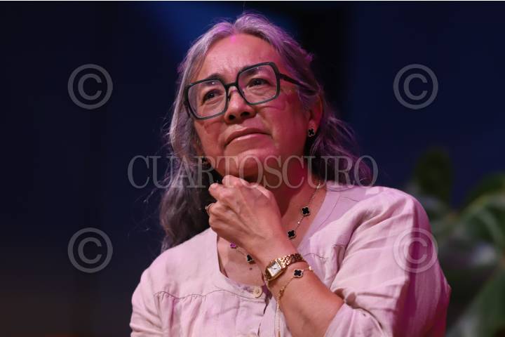 CIUDAD DE MÉXICO, 17JULIO2025.- La escritora, Cristina Rivera Garza, durante la presentación de sus nuevos libros " Andamos Perras, Andamos Diablas" y "Las Chicas Muertas Hablan al Unísono", esto durante la noche de este martes en las instalaciones de El Colegio Nacional. FOTO: DANIEL AUGUSTO/ CUARTOSCURO.COM