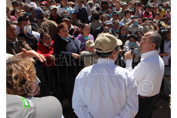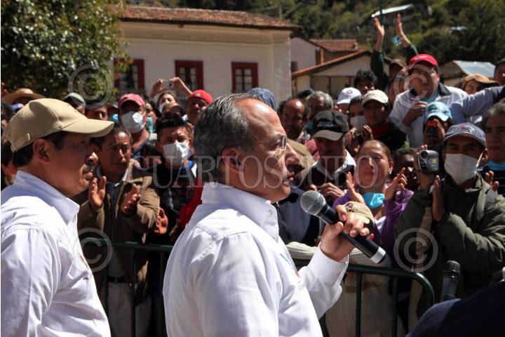 ANGANGUEO, MICHOACAN, 15FEBRERO2010,- Leonel Godoy, Gobernador del estado, en compañía con Felipe Calderón, dieron un recorrido en las zonas afectadas por las lluvias registradas en días pasados que provocaron la inundación de varias viviendas que se perdieron en su totalidad. FOTO: ALFREDO GUERRERO/CUARTOSCURO.COM