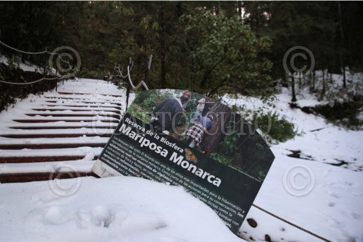 OCAMPO, MICHOACÁN, 10MARZO2016.- La undecima tormenta invernal dejó hasta medio metro de nieve a su pasó en las zonas más altas, en la comunidad de el Santuario El Rosario, la mariposa monarca se encuentra en riesgo con la helada que llegará hasta 3 grados centigrados. FOTO: ALAN ORTEGA /CUARTOSCURO.COM