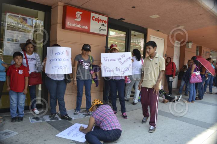 CHILPANCINGO , GUERRERO, 14OCTUBRE2014.- Profesores de la Coordinadora Estatal de Trabajadores de la Educación en el Estado de Guerrero (CETEG), que tiene más de 5 días en plantón en el zócalo y la plaza Primer Congreso de Anáhuac, tomaron las instituciones bancarias ubicadas en el centro de la ciudad y una tienda de la cadena Oxxo, como parte de sus movilizaciones por el caso Iguala. FOTO: JOSÉ I. HERNÁNDEZ /CUARTOSCURO.COM