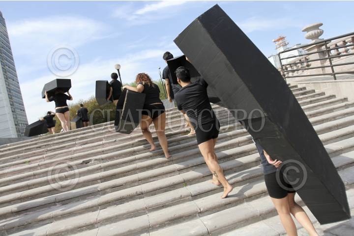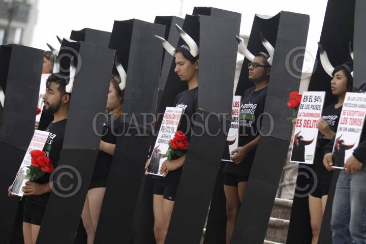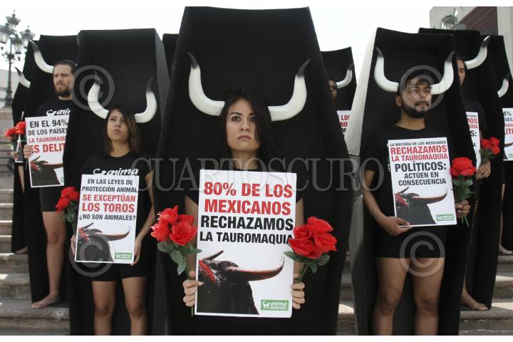 MONTERREY, NUEVO LEÓN, 02FEBRERO2014.- Miembros de organización protectora de animales Anima Naturalis se manifestaron en contra de la tauromaquia. Los activistas semidesnudos representaron con ataúdes la tortura a la que están expuestos los toros. El acto fue realizado en la Explanada de los Héroes. FOTO: GABRIELA PÉREZ MONTIEL / CUARTOSCURO.COM