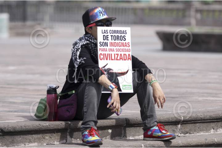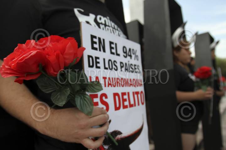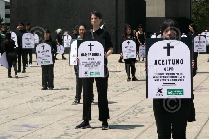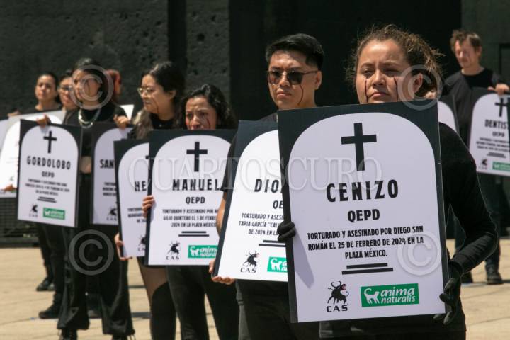 CIUDAD DE MÉXICO, 17MARZO2024.- Activistas de Anima Naturalis se manifestaron en contra de las corridas de toros, hoy se lleva a cabo una corrida en la Plaza de Toros México, hoy a medio día mostraron en un centenar de carteles los nombres de los toros que han sido "asesinados" en la actual temporada. FOTO: MOISÉS PABLO/CUARTOSCURO.COM