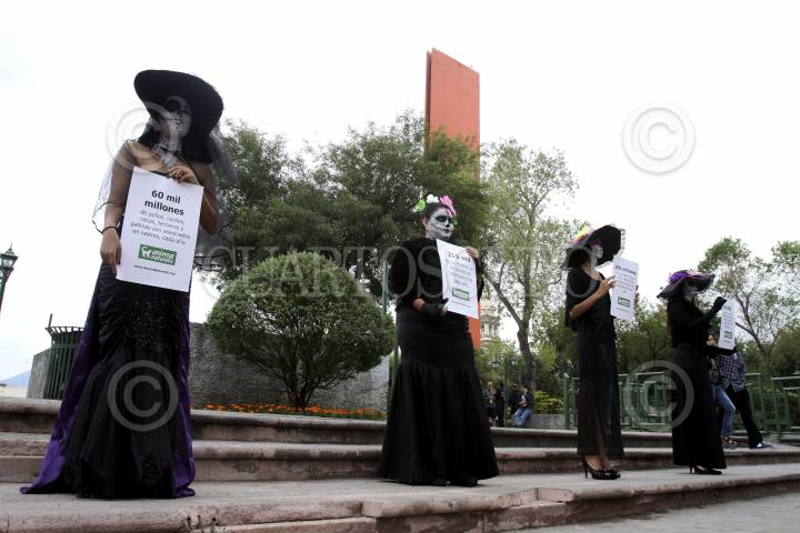 MONTERREY, NUEVO LEÓN, 02NOVIEMBRE2014.- Integrantes de Anima Naturalis protestaron con trajes de Catrina por los derechos de animales domésticos en la Macroplaza. FOTO: GABRIELA PÉREZ MONTIEL / CUARTOSCURO.COM