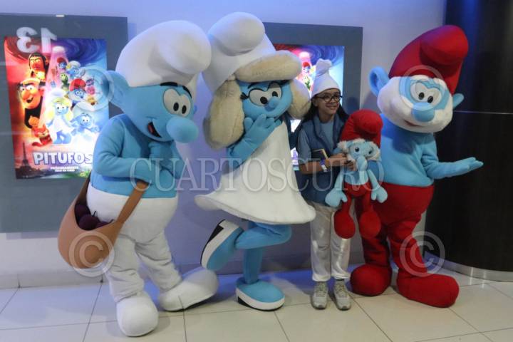 CIUDAD DE MÉXICO, 13JULIO2025.- Una niña acompañada de las botargas de los personajes de Pitufos durante el Photocall realizado en Cinépolis Perisur. FOTO: GRACIELA LÓPEZ/CUARTOSCURO.COM