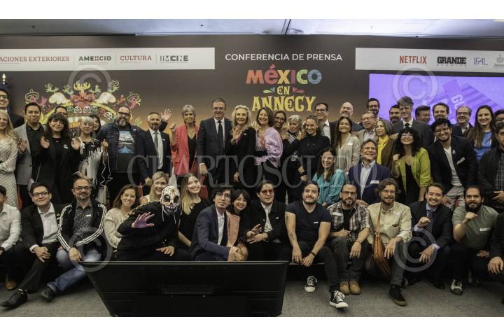 Marcelo Ebrard Casaubon, secretario de Relaciones Exteriores; Angelica Lara, directora taller del chucho taller donde se realizó Pinocho de Guillermo del Toro; Jordi Niestra, animador, Francisco Medina director y María Novaro, directora Instituto Mexicano de Cine, durante conferencia de prensa para dar más detalles de México como invitado de honor en el festival ANNECY.