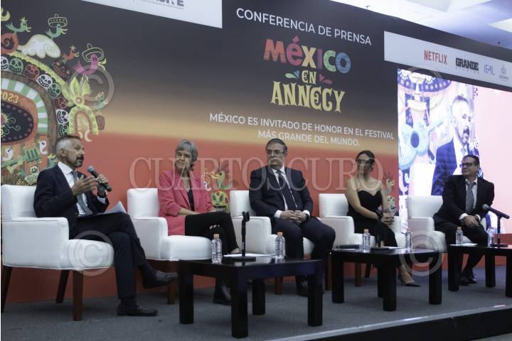 Marcelo Ebrard Casaubon, secretario de Relaciones Exteriores; Angelica Lara, directora taller del chucho taller donde se realizó Pinocho de Guillermo del Toro; Jordi Niestra, animador, Francisco Medina director y María Novaro, directora del Instituto Mexicano de Cine, durante conferencia de prensa para dar más detalles de México como invitado de honor en el festival ANNECY.