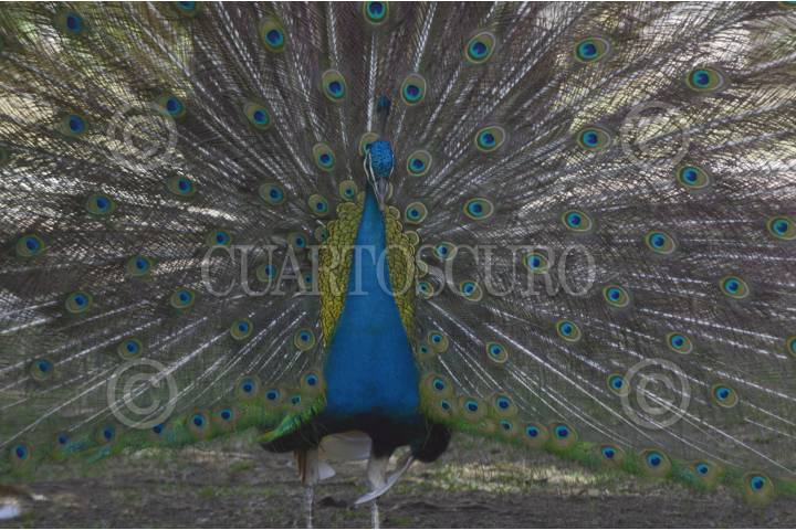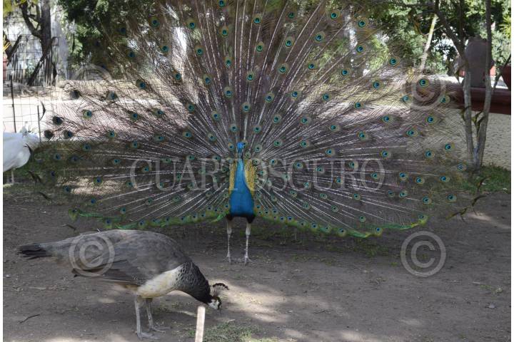 CHILPANCINGO, GUERRERO, 28DICIEMBRE2015.- Un pavo real de pecho azul abre su abanico policromado para cortejar a la hembra en la jardinera de Casa Guerrero. FOTO: JOSÉ I. HENÁNDEZ /CUARTOSCURO.COM