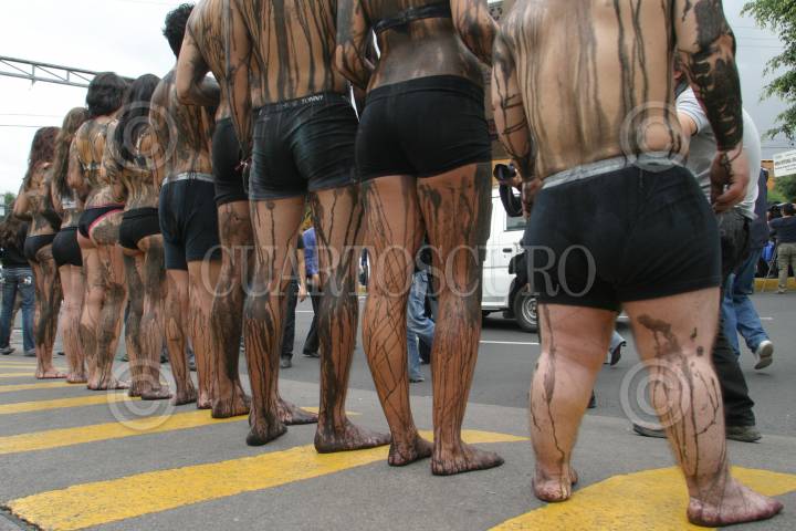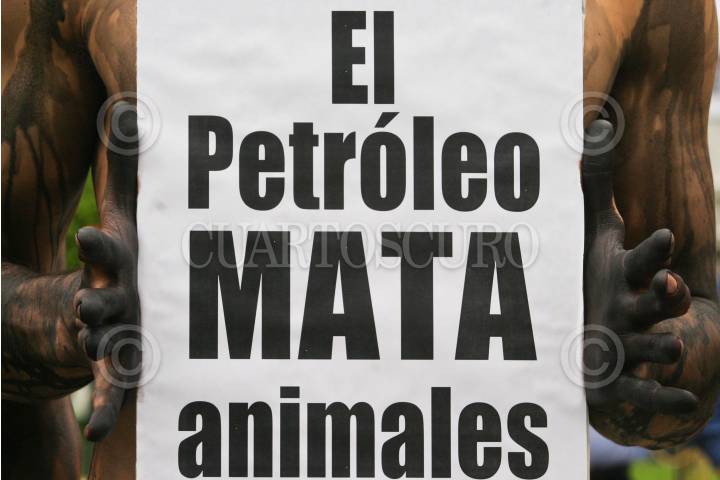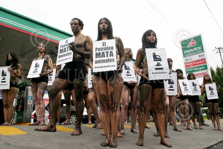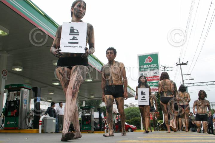 MÉXICO, D.F., 22JULIO2010.- Activistas de AnimaNaturalis, se manifestaron frente a una gasolinera ubicada en las esquina de Río Churubusco y avenida Universidad con la finalidad que el Gobierno Federal y las autoridades correspondientes, implemente un plan de acciones para evitar que el petroleo derramado en el Golfo de México dañe las costas mexicanas. FOTO: ENRIQUE ORDÓÑEZ/CUARTOSCURO.COM