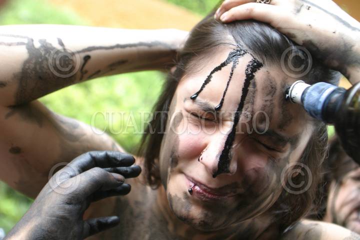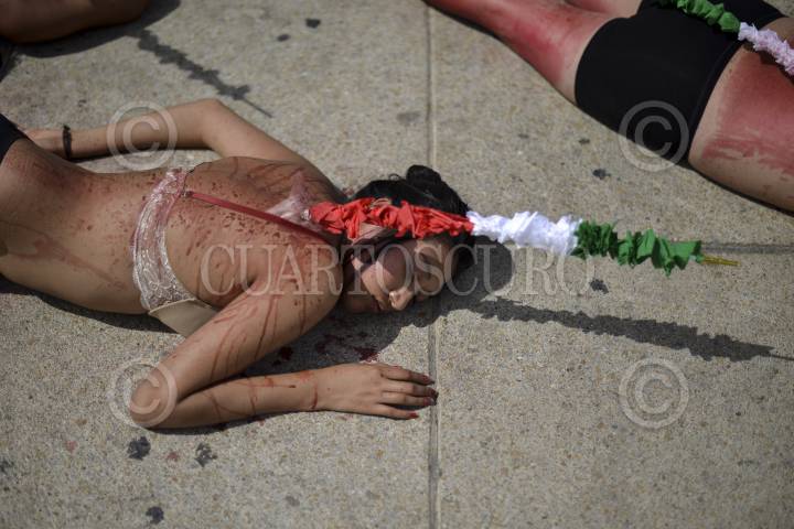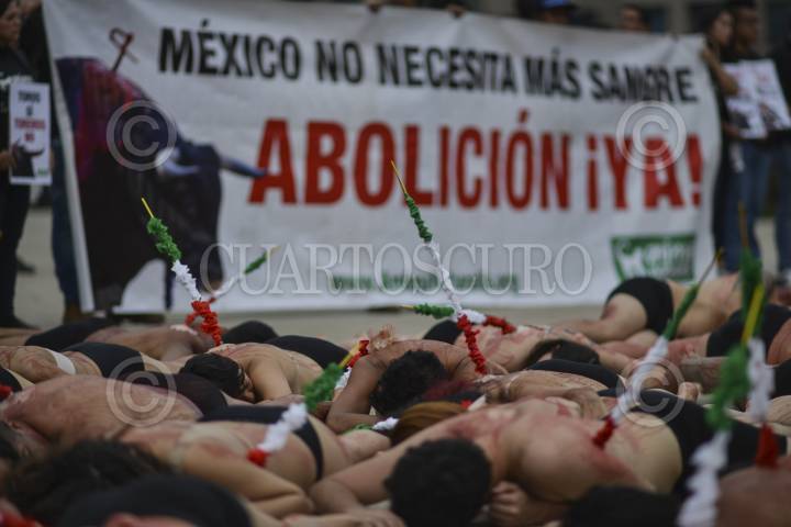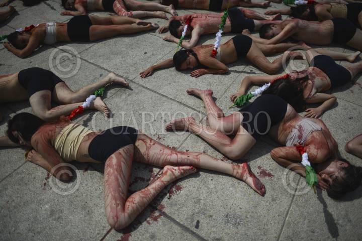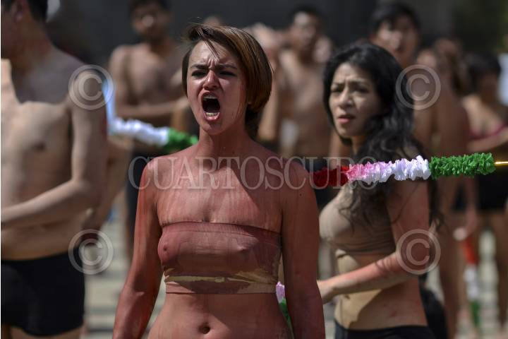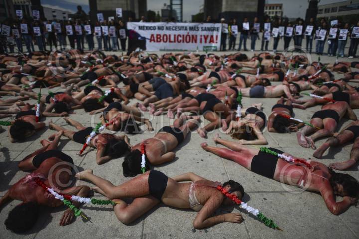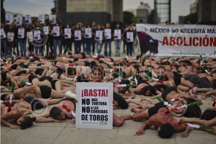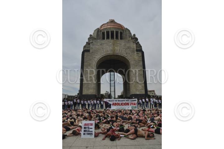 CIUDAD DE MÉXICO, 07FEBRERO2016.- Integrantes de protección de los derechos de los animales "AnimaNaturalis" semidesnudos realizaron una representación de la muerte de los toros en la explanada del Monumento a la Revolución para exigir la abolición de las corridas de toros en el país. FOTO: ADOLFO VLADIMIR /CUARTOSCURO.COM