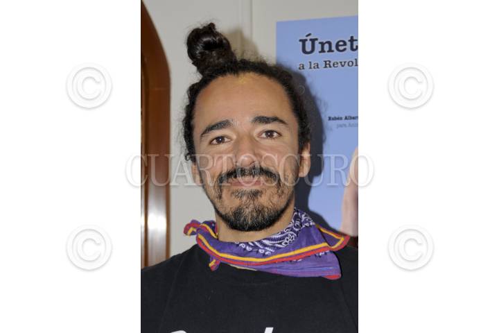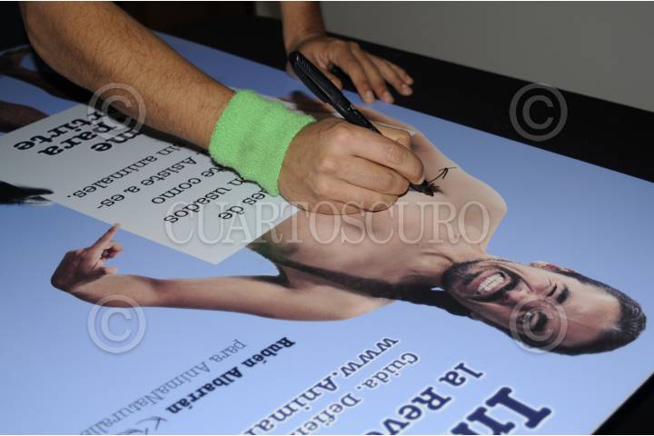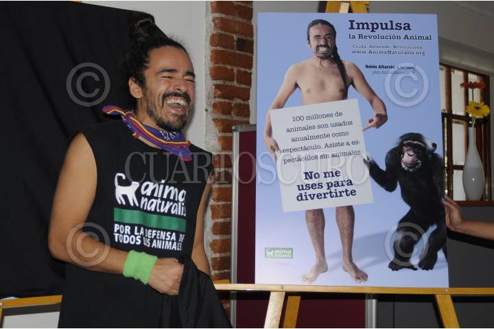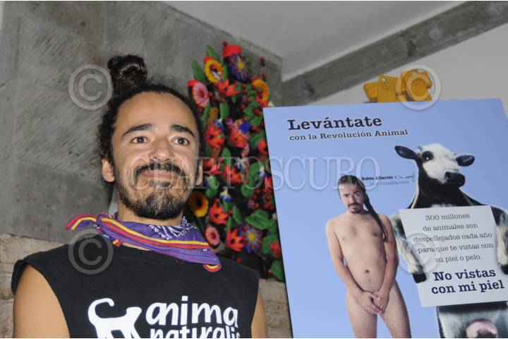MÉXICO, D.F., 14MARZO2012.- Rubén Barragán, músico y vocalista del grupo Café Tacvba, durante la conferencia de prensa en compañía de la organización en defensa de los animales, AnimaNaturalis, para promover la campaña "Revolución Animal", haciendo un llamado a gobiernos, sociedad y medios de comunicación, ante el maltrato y exterminio de miles de millones de animales que mueren en la industria de alimentos, vestimenta, prueba de laboratorios y espectáculos. El cantante apoya el movimiento con varios carteles donde aparece desnudo promoviendo los derechos de los animales. FOTO: DIEGO SIMÓN SÁNCHEZ /CUARTOSCURO.COM