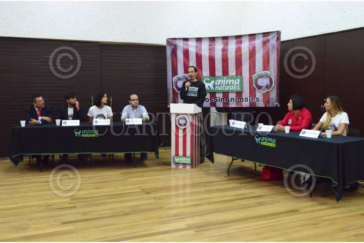 MÉXICO, D.F., 14MARZO2012.- Leonora Esquivel, directora de AnimaNaturalis, Rubén Barragán, músico y vocalista del grupo Café Tacvba, y Juan Antonio Salazar, director de la agencia Nexus, durante la conferencia de prensa para promover la campaña "Revolución Animal", haciendo un llamado a gobiernos, sociedad y medios de comunicación, ante el maltrato y exterminio de miles de millones de animales que mueren en la industria de alimentos, vestimenta, prueba de laboratorios y espectáculos. El cantante tacvbo apoya el movimiento con varios carteles donde aparece desnudo promoviendo los derechos de los animales. FOTO: DIEGO SIMÓN SÁNCHEZ /CUARTOSCURO.COM