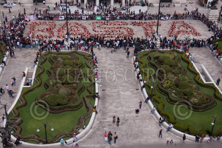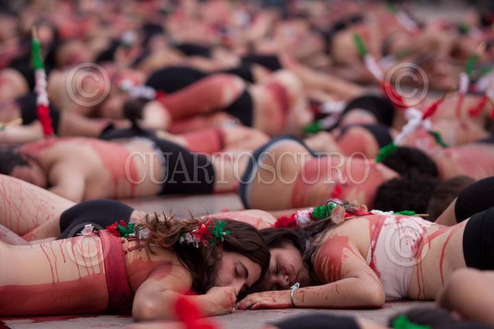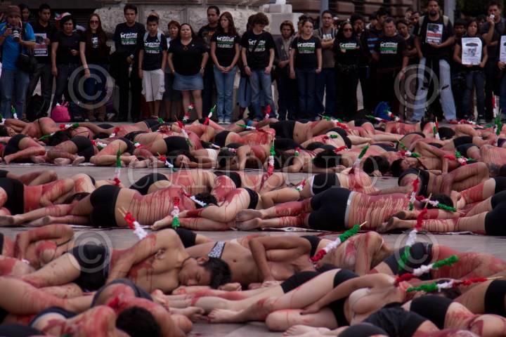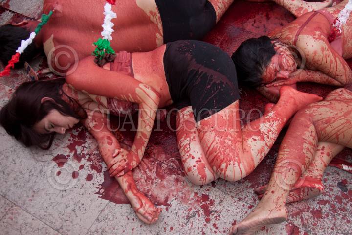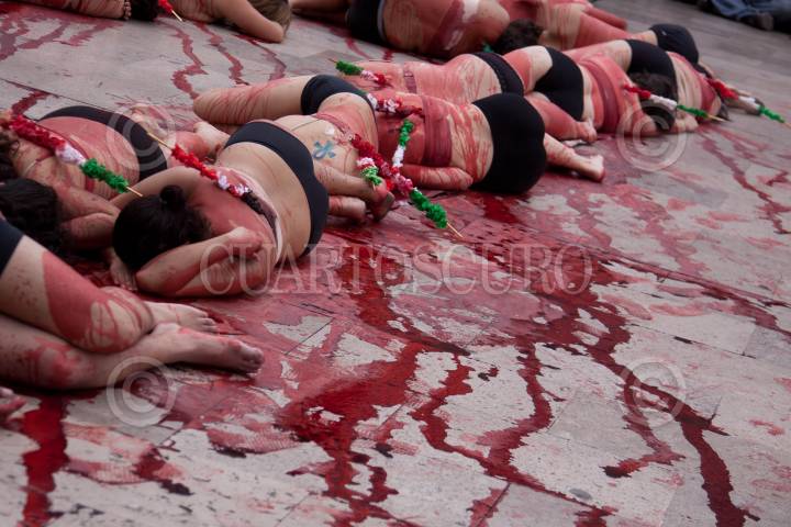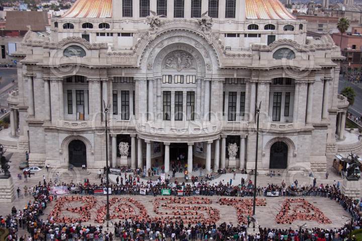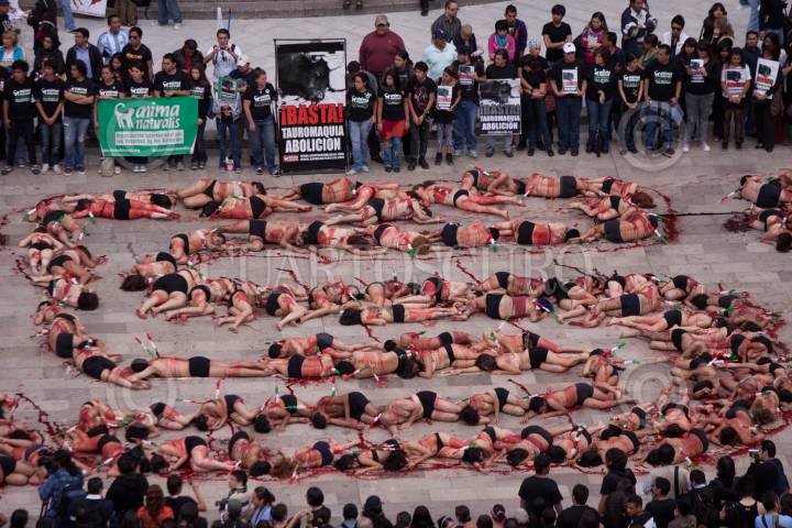 MÉXICO, D.F., 06FEBRERO2011.- Activistas de la organización ambientalista AnimaNaturalis se manifestaron semidesnudos y banderillados frente al Palacio de Bellas Artes formando la palabra BASTA para exigir al gobierno la abolición de la tauromaquia. FOTO: IVÁN STEPHENS/CUARTOSCURO.COM