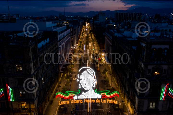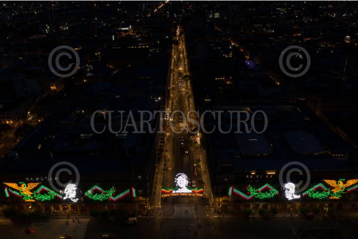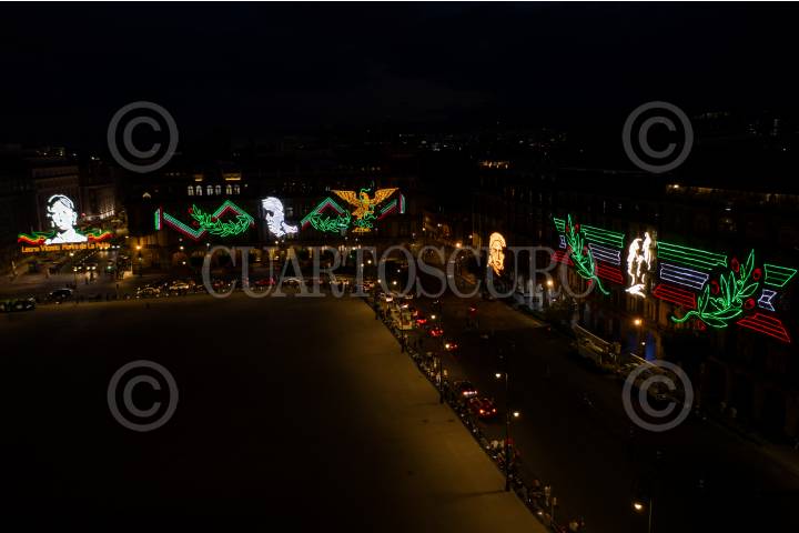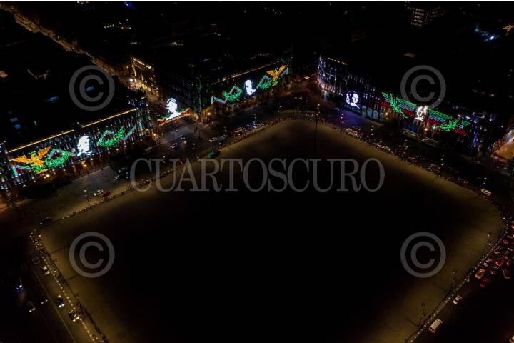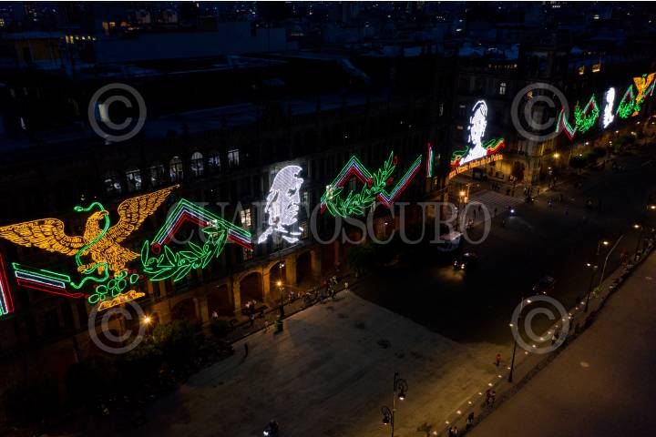 Tomas aéreas de la luminaria con motivo de las fiestas patrias encendidas en el Zócalo capitalino.