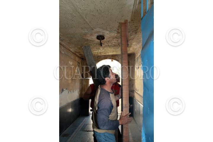 MEXICO, D.F.13ABRIL2007.-Debido al sismo de anoche, el inmueble ubicado en la calle de Amsterdam número 25, sufrió fuertes cuartedaduras en la fachada, lo que ocasionó que Protección Civil reubicara a las 10 famillias que habitaban el edificio, al albergue del Centro Rayo, del INVI. Trabajadores de protección civil apuntalan con polines una de las losas, para reforzarla. FOTO JEFTE ARGUELLO/CUARTOSCURO.COM
