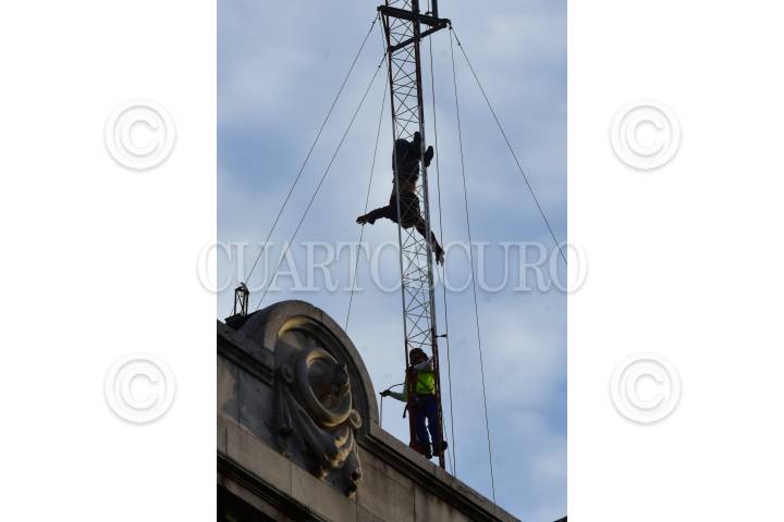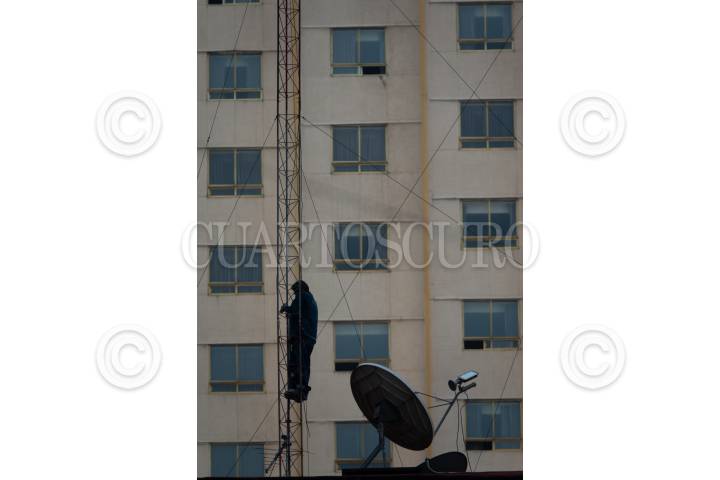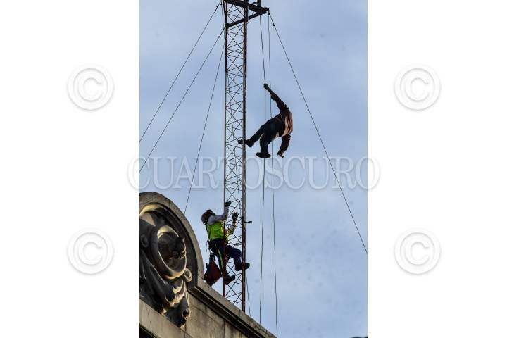 Un hombre trabaja en una antena en las alturas de Paseo de la Reforma.
