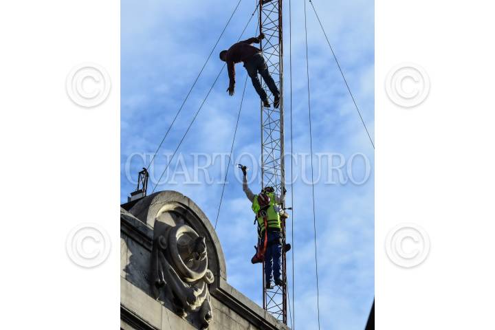 CIUDAD DE MÉXICO, 02NOVIEMBRE2018.- Un hombre de aproximadamente 30 años escaló la antena de aproximadamente 15 metros de altura que se encuentra en la azotea del Centro Joyero que se ubica en las calles de Francisco I. Madero y la esquina de Isabel La Católica en el centro de la ciudad. El hombre amenazaba con aventarse, mientras tanto equipos de emergencias ERUM y Bomberos acudieron para para convencerlo que bajara, el hombre desistió de arrogarse y fue trasladado a un hospital para su atención. FOTO: ARMANDO MONROY /CUARTOSCURO.COM