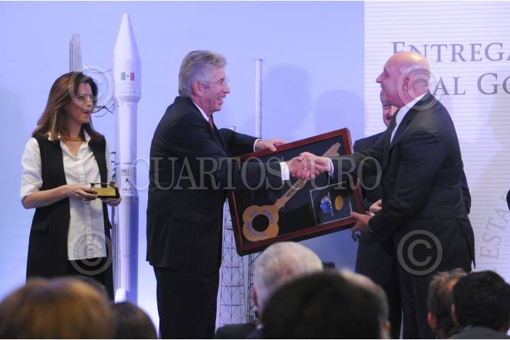 CIUDAD DE MÉXICO, 25AGOSTO2016.- Mark Spiwak, presidente de Boeing Satellite Systems International, entregó un reconocimiento a Gerardo Ruiz Esparza, secretario de Comunicaciones y Transportes, durante el evento en el cual la empresa Boeing entregó el control total del Sistema Satelital Mexicano (Mexsat) incluido el del satélite Morelos 3, que fue lanzado en octubre de 2015, al gobierno mexicano. Dicho evento se desarrolló en el Conjunto Nacional de Telecomunicaciones ubicado en la delegación Iztapalapa. FOTO: DIEGO SIMÓN SÁNCHEZ /CUARTOSCURO.COM